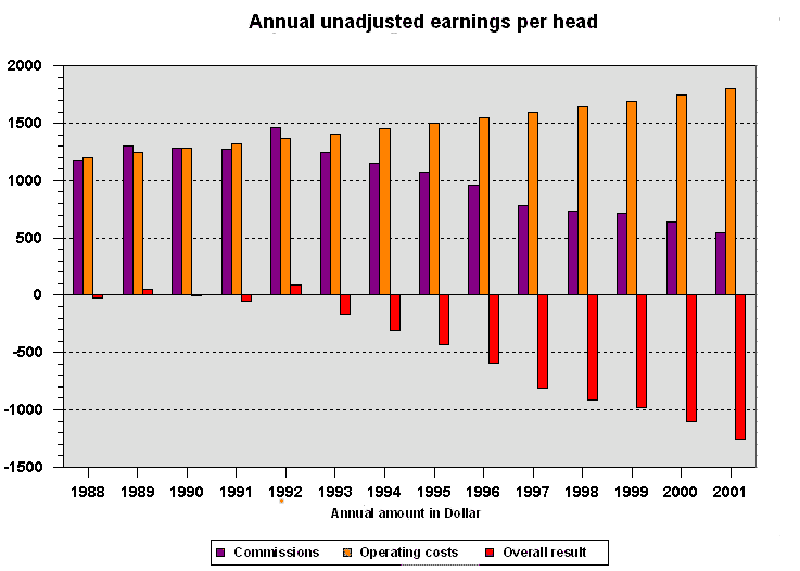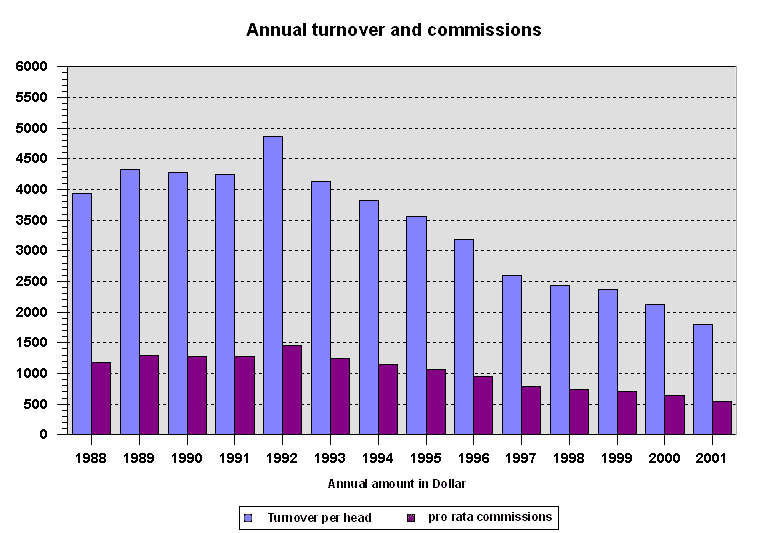 The type and size of these expenses are dependent on the type of products marketed and the individual companies. Estimating a $100/ month in business expenses, on the basis of 1988, the expenses are a know and small yearly amount. Because inflation this amount was incremented 3 per cent linear per year.
